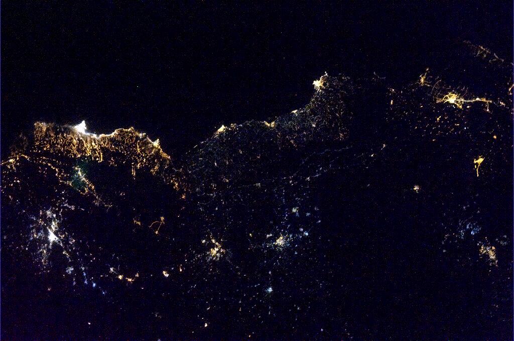 Photographed by Commander Chris Hadfield. Tartus and Latakia, on the Syrian coast, who seem to use different light bulbs. photo source: Twitter from CommanderHadfield
