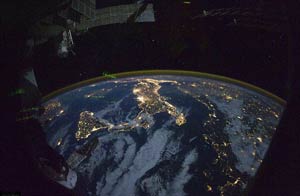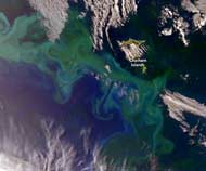 | Orbital View: Phytoplankton off New Zealand. The ocean around the Chatham Islands, off the coast of New Zealand, is particularly fertile — and a carbon sink. Two currents meet around the islands, supplying each with the nutrients and iron fertilisers the other lacks. The mingling currents foster huge blooms of phytoplankton (the green swirls in the image), which in turn support huge numbers of fish. The phytoplankton blooms, which are essentially underwater plants, are strongest in the spring. |