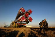 | Soyuz TMA-11 spacecraft is shown on its railcar on the way to its launch pad at Bikonur, Cosmodrome, Kazakhstan, 8 October 2007 by NASA Photographer Bill Ingalls. Expedition 16 was launched on 10 October, carrying Commander Peggy Whitson, Flight Engineer and Soyuz Commander Yuri Malenchenko and Malaysian Spaceflight Participant Sheikh Muszaphar Shukor to the International Space Station. Whitson and Malenchenko will spend 6 months on the station. Shukor, flying under an agreement between Malaysia and the Russian Federal Space Agency, returned to Earth on 21 October with two of the Expedition 15 crewmembers who were already on the complex. |