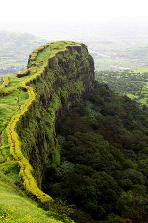 - Lohagad (literally “Iron fort” in Marathi) is one of the many hill forts of Chatrapati Shivaji, nestled in the side range of the Sahyadri Mountains. It divides the basins of the Indrayani and Pavana Rivers. This is the west side, showing the Vinchukata (Scorpion Tail) fortification. It stands 3,450 feet (1,052 metres) tall, near Lonavala. It’s said to have been used by many dynasties that ruled the Marathi kingdom. There are many structures built on the fort, including a water tank and temple. It is a favourite among modern-day trekkers.