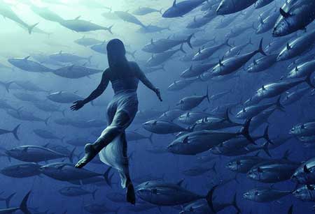 - Retired Japanese Olympic synchronised swimmer Saho Harada poses balletically inside a shoal of tuna.