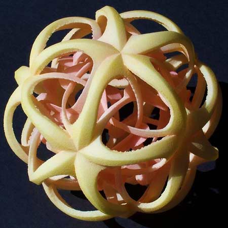 This 4-inch in diameter nylon sculpture is made by solid freeform fabrication. The nylon is yellow on the exterior and pink inside. An important component in tissue engineering is the 3D scaffold, which guides cells to form target tissue, maintains tissue volume, and provides sufficient structural support during tissue regeneration. Until recently, conventional scaffold fabrication methods have not satisfied the requirements for tissue regeneration. The development of additive fabrication technologies known as solid freeform fabrication (SFF) has made it possible to construct scaffolds with very fine structures and complex geometries using computer-aided design (CAD) data acquired from medical imaging of patients. Due to the advantages of SFF technology, it’s rapidly becoming the technique of choice. Moreover, recent research has demonstrated that a variety of biomaterials are suitable for use in various SFF systems. The “printing ink” is a cell-seeded alginate hydrogel modified to be compatible with extrusion through a printing deposition tool. Or you can just make a work of art like this one instead.