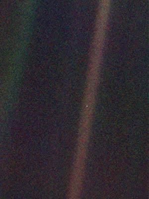 - Seen from about 6 billion kilometres (3.7 billion miles, 40 astronomical units), Earth appears as a tiny dot (the blueish-white speck approximately halfway down the lighter brown vertical band) within the darkness of deep space. Photographed by Voyager 1 in 1990. Earth lies right in the centre of one of the scattered light rays resulting from taking the image so close to the sun. The background features in the image are artefacts resulting from magnification.