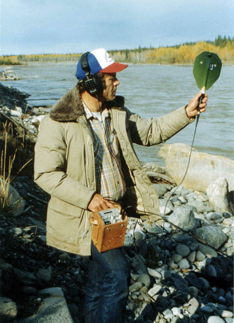 Photographed by the US Fish and Wildlife Service. A man holds a radio sensor used for tracking tagged salmon (taken in 2008). photo source: USFishAndWildlife