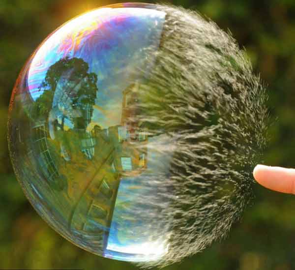 As the finger breaks the surface tension, the perfect sphere is replaced by a round mass of soapy droplets which dissolve into the air.