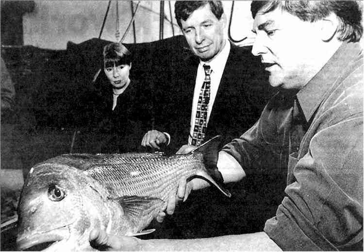 Crop and food research senior scientist Alistair Jarrett shows Fisheries Minister John Luxton a snapper under sedation Fresh salmon could taste better than ever, according to the New Zealand developers of a natural salmon anæsthetic that is being marketed overseas. Fisheries Minister John Luxton saw the technology demonstrated on a snapper when he visited the Crop and Food Research Nelson seafood unit yesterday afternoon. The fish lay in his hands under the influence of the anæsthetic, as if dead but for its slightly moving mouth, and posed no threat to his suit. It was returned to the pool afterward to recover. Crop and Food Research spokesman Alex Lemon said the anæsthetic, AQUI-S, allowed salmon to be sedated before being handled and harvested so stress and exhaustion were minimised. During the past decade, New Zealand's salmon industry has more than tripled in size, from 2000 tonnes a year to 7500 tonnes. Seventy per cent of the salmon goes overseas, bringing export earnings of $40 million. The research institute receives royalties from overseas users of the anæsthetic. It was developed by the institute with the assistance of the Public Good Science Fund, and was being marketed by the AQUI-S Ltd joint venture company, Mr Lemon said. The American Food and Drug Administration was considering approving AQUI-S, he added. AQUI-S New Zealand says the gentle and humane anæsthetic also allows easy harvesting of other fish, such as lobsters and eels. Source: The Dominion Friday 9 July 1999 photo credit Nelson Mail