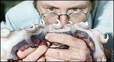 Steve O'Shea examines the squid's Sperm whales eat the species, but a whale washed up on the Mahia Peninsula recently showed evidence of gouges and cuts from a battle with a squid. Scientists have known for some time that the species existed in the deep, cold ocean south of New Zealand, but they are surprised that this one was found on the surface. Dr O'Shea said the formidable squid has the largest eyes in the animal kingdom. The specimen is an immature female and although it is difficult to predict how large it could get, Dr O'Shea said he would expect it to reach 1½ times its present size. "I'm not exaggerating. This is a killer squid. From a science point of view, this is absolutely priceless." The specimen will be preserved whole and could eventually be put on display, possibly at Te Papa. Dr O'Shea said the find showed that the colossal squid was lurking further north than previously thought. Killer squid: