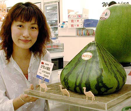 Watermelons usually sit awkwardly and take up a lot of space in a refrigerator. Unfortunately, odd shapes appear to have an adverse effect on sweetness. Only 800 - 1,000 square watermelons are harvested per season, mainly sold as decorations. Because the method of cultivation is difficult, only 5 - 10 pyramidal melons are produced yearly - but they sell for US$650 each. Next up - "human-faced" melons...