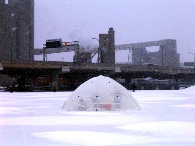 The matrix used in the fabrication of these domes is made from an inflatable vinyl structure whose frame is composed of plastic pipes pierced all around. Once this is arranged on a frozen flat surface of water and equipped with a rechargeable battery, it is connected to a blower that inflates it with air and to a "heating" pump that collects the water under the ice and circulates it into the pipes. A fog disperses and covers the surface which, upon contact with the air (-10º to -20º Celsius), is transformed into a fine film of ice in about 12 hours. Once the transparent shell stabilises, the matrix is then deflated and reused for a new dome. Each dome has a 6-metre diameter and a height of roughly two metres, and the ice layer that contains their dwelling should reach a thickness of four centimetres at its base and 6 centimetres at its peak. Born of collaboration between two artists, this collective is interested in experimental constructions adapted to daily life and uses its know-how for the conception and production of Ice Domes. While Ana Rewakowicz has experimented for several years on inflatable elements responding to imaginary needs, Steve Topping has been creating shelters and alternative spaces that he approaches as temporary and transportable residences. The ice domes are part of a contemporary artistic current preoccupied with the precariousness of the living conditions of a certain population, namely homeless people. But they also correspond with the utopia of creating nomadic and autarkical dwellings in the form of a "survival kit" adapted to our harsh climate. Source: plein-sud.org
