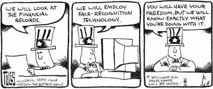 Alone, any one of these technologies might make sense. Facial-recognition cameras can make public events safer. Red-light cameras slash deadly light-running. The device that allows car-rental companies to track their customers' speed also lets them open the door if locked out. Nor is there any particular reason that a rental car company should be barred from tracking the use of its property, or that an employer should be prevented from monitoring its workers' productivity. People who object can always choose to shop or work elsewhere. If enough do, the policies will change. Nevertheless, the advancing juggernaut of intrusion collectively conjures a discomforting vision: an Orwellian society in which every move is monitored, every record bared. Another technology in the news lately even allows scanning of people's movements inside their homes by tracing the heat they give off. The Supreme Court ruled that the use of such "thermal imaging" without a search warrant is unconstitutional. Standing in the way of technological progress is usually as fruitless as it is counterproductive, unless some critical principle is at stake - such as the right to be free of government intrusion in your home. The question is whether anyone will notice when that threshold is crossed next. Source: USA Today Wednesday 11 July 2001 See also: