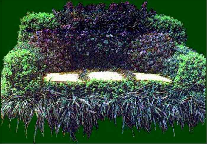 by Shawn Sell Couch potatoes, beware: linger too long on this sofa and you might start sprouting yourself. Cultivating Growth, the northern hemishpere's newest piece of urban street art, is a living sofa dreamed up by the Chicago Botanic Garden. Unlike all that fiberglass furniture also dotting downtown as part of Suite Home Chicago, this creative couch at the Harris Bank Plaza is covered with live plants. "We wanted to make it fun and easy to take care of, so we used common plants that would take sun or shade and dry and windy conditions," says Cindy Baker, the garden's project manager. "We installed an internal watering system because horticulture in the city is very different than in the suburbs." The garden topiary features creeping jenny as the main "upholstery" on its steel frame, a seat made from flagstones and thyme, arm coverings made of water hyssop, pillows fashioned from hens and chicks and a throw of blue fan flowers. The sofa is 66 inches wide, 30 inches deep and 44 inches high. Source: USA Today Friday 6 July 2001; photo credit William Biderbost, Chicago Botanic Garden